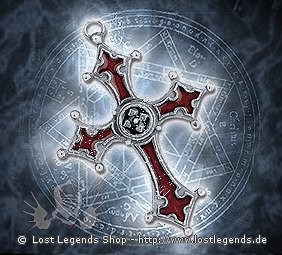 Gothic pewter cross with "haemoglobin" red and black enamel.