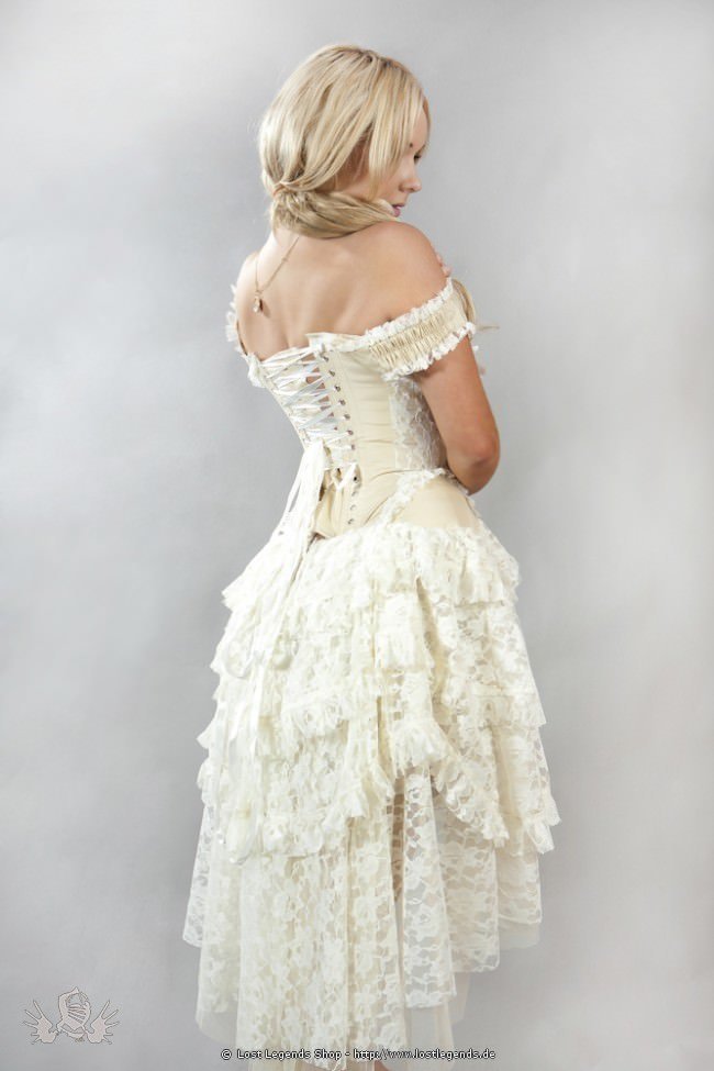 Wunderschönes Korsett-Kleid mit langem Rüschenrock, vorne kürzer gehalten, hinten weit auslauffend. Im Rücken geschnürt und mit Stäbchen verstärkt.