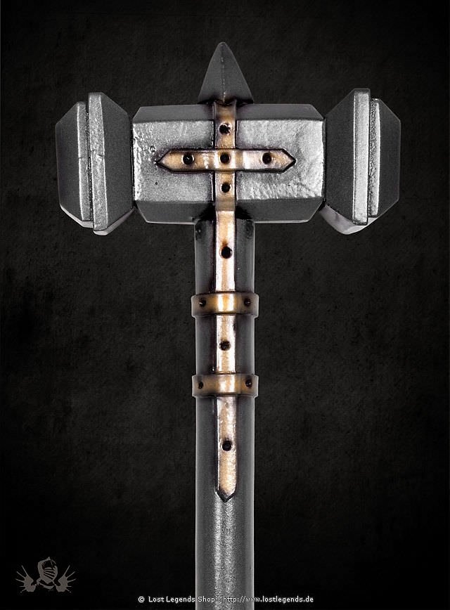 Der Dorn auf dem doppelseitigen Hammer sorgt dafür, dass er nicht nur als Hieb-, sondern auch als Stichwaffe eingesetzt werden kann. Der Kernstab ist aus leichtem Fiberglas hergestellt. Der Hartgummi-Griff ist mit echtem Leder umwickelt, daher liegt der Paladin-Kriegshammer sowohl angenehm, als auch sicher in der Hand.