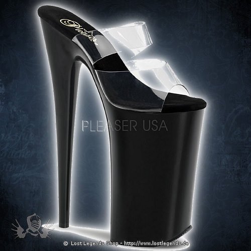 10″ High-Heel, 6 1/4″ Plateau Two-Band Slide in der Farbe Klar/Schwarz.