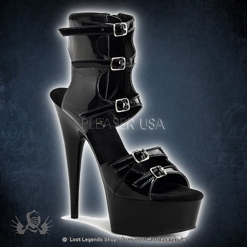 6″ High-Heel, 1 3/4″ Plateau Strappy Ankle High Buckle-Up Sandal in der Farbe Schwarz/ Schwarz.