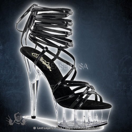 6″ High-Heel, 1 3/4″ Plateau Strappy Wrap Around Ankle Strap Sandal in der Farbe Schwarz/Klar.