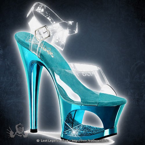 7″ Cut-Out Plateau Ankle Strap Sandalen in der Farbe Klar/Turquoise Chrom.