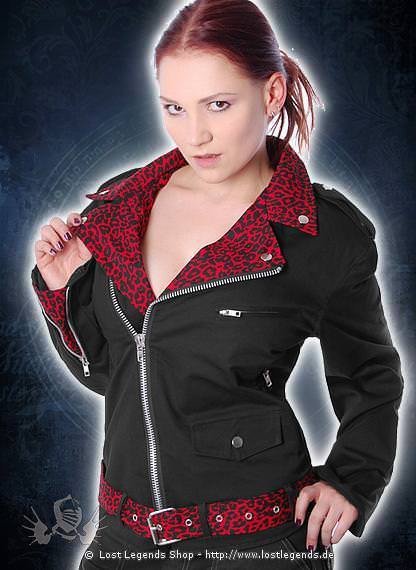 Langärmlige Jacke mit Reißverschluss und rotem Leopardenmuster verziert.