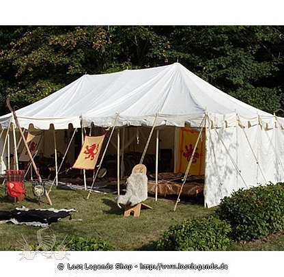 Dieses viereckige Mittelalterzelt bietet für jeden Zweck genug Raum. Ob als mittelalterlicher Marktstand, als Baldachin, also Sonnenschutz ohne Seitenwände oder als Schlafzelt für 10-15 Personen Besatzung inklusive Gepäck und Gerümpel. Die umlaufende Schabracke macht es zu einem wahren Hingucker. Das Zelt ist mit ein paar Händen in Windeseile auf- und auch wieder abgebaut. Durch die hohen Seitenwände hat man an jedem Ort des Zeltes auch genügend Standhöhe. Dieses Ritterzelt ist ein wahres Allroundtalent. Durch die einzeln abnehmbaren Seitenplanen bleibt Dein Spielraum im wahrsten Sinne nach allen Seiten offen. Das große fest angenähte Vordach (Baldachin) sorgt zum einen für ein schattiges Plätzchen bei Sonne und zum anderen für einen trockenen Fuß bei Regen - bei einer ausreichenden Eingangshöhe von ca. 1,80 m.