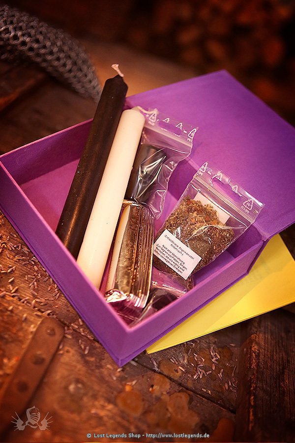 Ritualset bestehend aus einem speziellen Ritualöl mit reinen ätherischen Ölen, einer passenden magischen Räucherung, zwei durchgefärbten Kerzen, einem geladenen Trommelstein, Räucherkohle und ausführlicher Ritualbeschreibung.