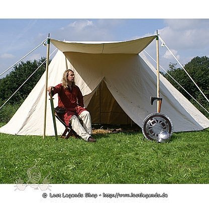 Dieses schöne und sehr authentische, zweimastige Sachsenzelt basiert auf historischen Vorlagen, z. B. Zeichnungen aus dem Utrechter Psalter aus den Anfängen des 9. Jahrhunderts (frühes Mittelalter). Es bietet geüngend Platz für 3-4 Personen inklusive Gepäck und Gerümpel. Die Mittelhöhe von 2,50 m bietet genug Höhe um sich im Stehen anzuziehen. Das große, fest angenähte Vordach (Baldachin) sorgt zum einen für ein schattiges Plätzchen bei Sonne und zum anderen für einen trockenen Fuß bei Regen - bei einer ausreichenden Eingangshöhe von 1,80 m. Dieses robuste und sehr authentische Sachsenzelt ist nicht nur wegen seines günstigen Preises, sondern auch wegen der hervorragenden Verarbeitung ein unentbehrlicher Ausrüstungsgegenstand für Heerlager, Mittelaltermarkt oder Larp.