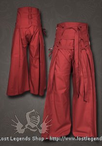 LARP Hose im Samurai Stil. Die Hose wird beim Anlegen seitlich eingeschlagen und mit drei Schürungen an der Vorderseite verschlossen. Dadurch kann sie individuell angepasst werden. Die Innenseite der Hose ist aus schwarzem Stoff gearbeitet. Seitlich und an der Rückseite befinden sich Stoffschlaufen, die z.B. als Waffenhalterung verwendet werden können.