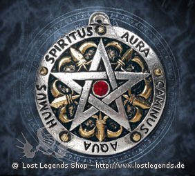 Umgeben von den fünf Elementen, in lateinisch geschrieben, kann dieses in heraldischem Stil gehaltene Pentagramm getragen werden, um Stabilität und innere Harmonie zu erreichen.