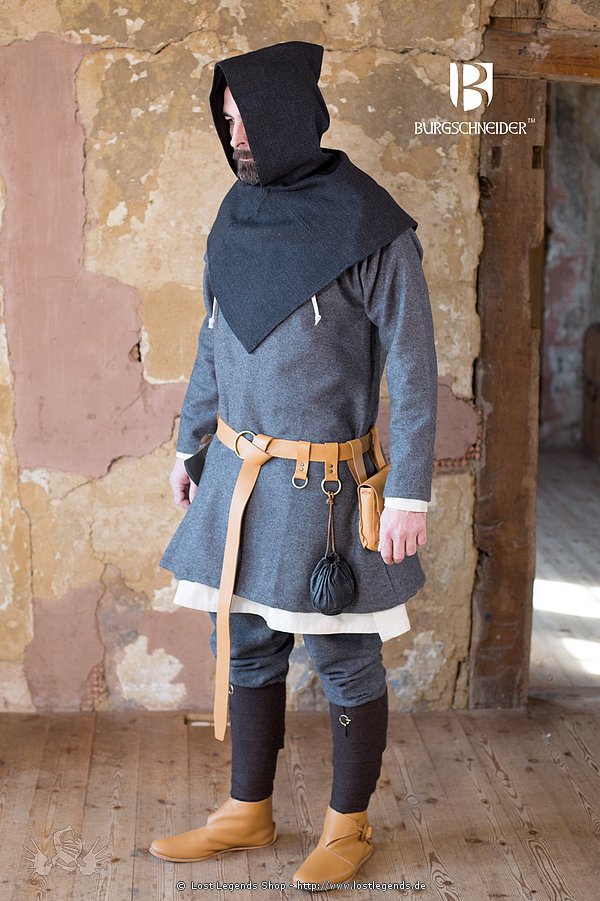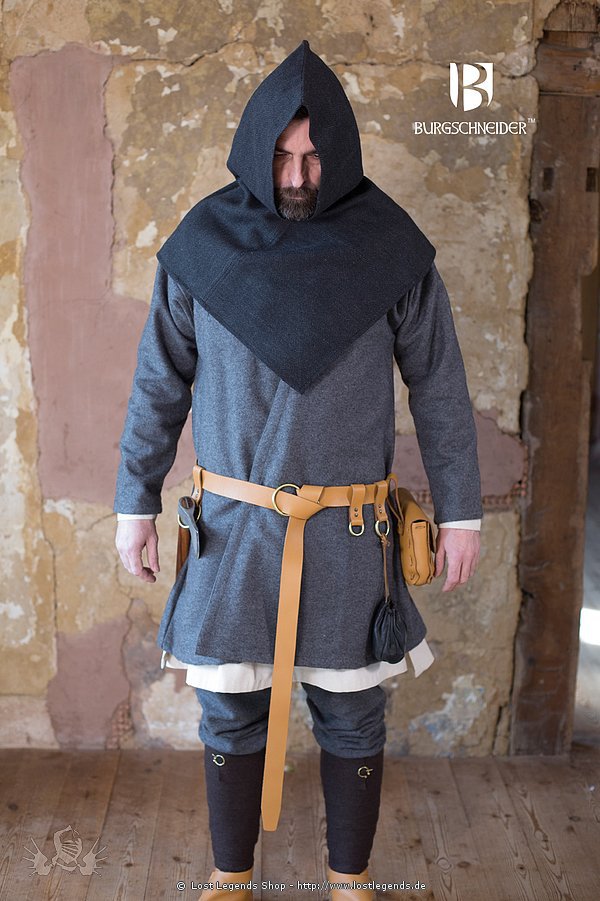 Die Kapuze hat eine quadratische Grundform, charakteristisch endet die breite Krempe mit einer Ecke auf der Brust.