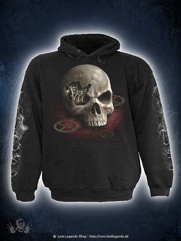 A dandily dressed masked steam punk skeleton clutches his guns ready for action, a cracked skull reveals his true mechanical inner workings.