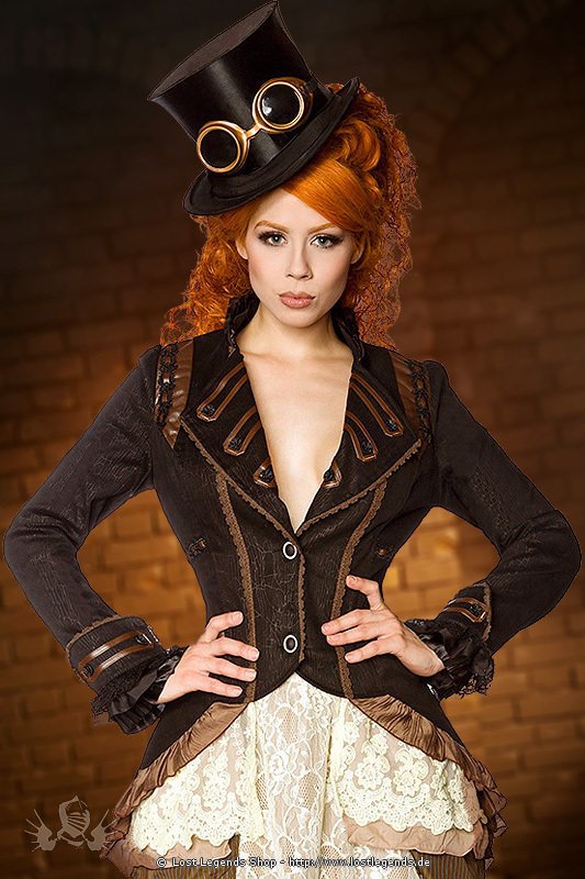 Außergewöhnlicher Frack im Steampunk-Stil mit geprägter Musterung und Zierborten. Die Jacke besticht durch Details aus Spitze, Satin und Netzstoff, vorne mit zwei Knöpfen geschlossen. Rückenlänge ca. 95 cm