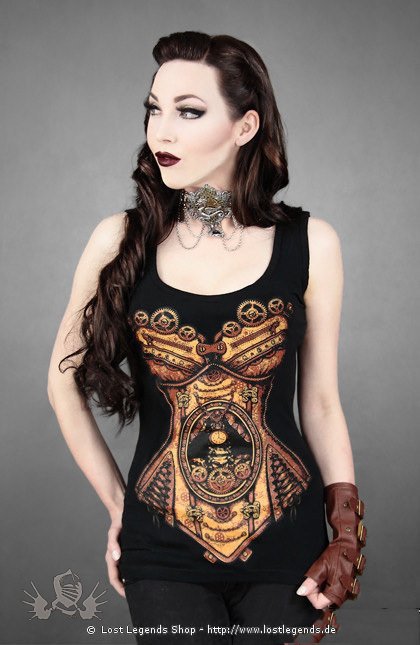 Schwarzes Top mit rundem Ausschnitt und aufgedrucktem Steampunk Korsett. So kann man auch im Alltag sein Steampunk Korsett immer tragen.