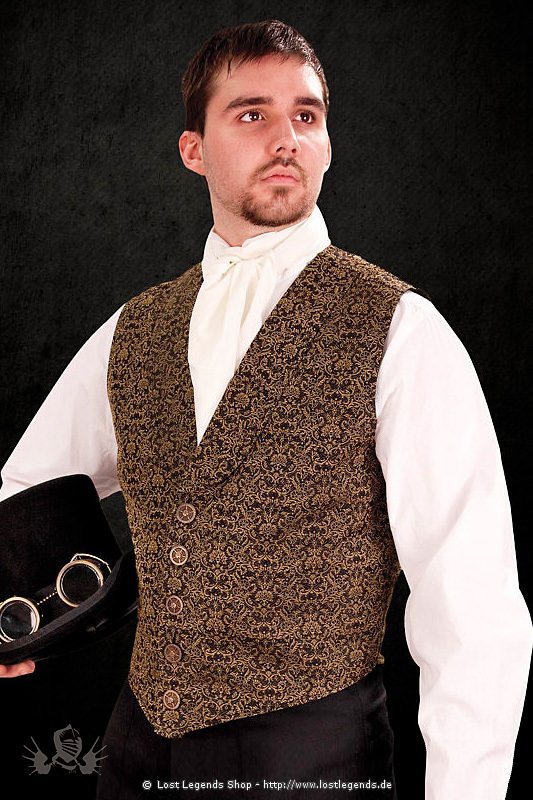 Elegante und besonders vornehme Steampunk Weste mit schwarz-goldenem Brokatmuster und kontrastreich abgesetztem Satin-Innenfutter. Das breite aufgeschlagene Revert gibt einen klassischen Look in Anlehnung an die viktorianische Mode des 19. Jahrhunderts.