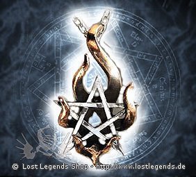 Magical pentagram consumed by the purifying flames of divinity; bronzed two-tone.