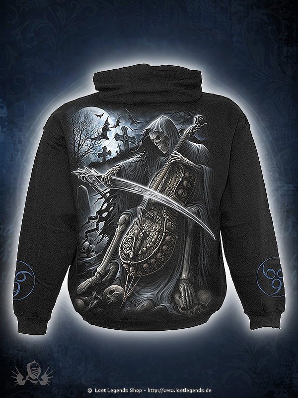 The Grim Reaper grieves over the dead in a cemetery, playing a cello with his scythe to calm the souls of the lives he has taken.