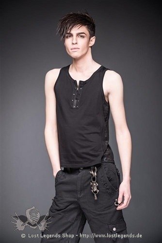 Am Halsausschnitt dieses ärmellosen Tops befindet sich ein mit schwarzen Rundnieten besetzter Reißverschluss. Ein grauer DARK INDUSTRIES Print ziert die Seite.