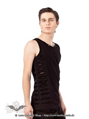 Mit diesem seitlich geschlitzten und mit Netz unterlegten Tank Top von Queen of Darkness hast Du den Durchblick. Der Halsausschnitt ist mit Nieten besetzt.
