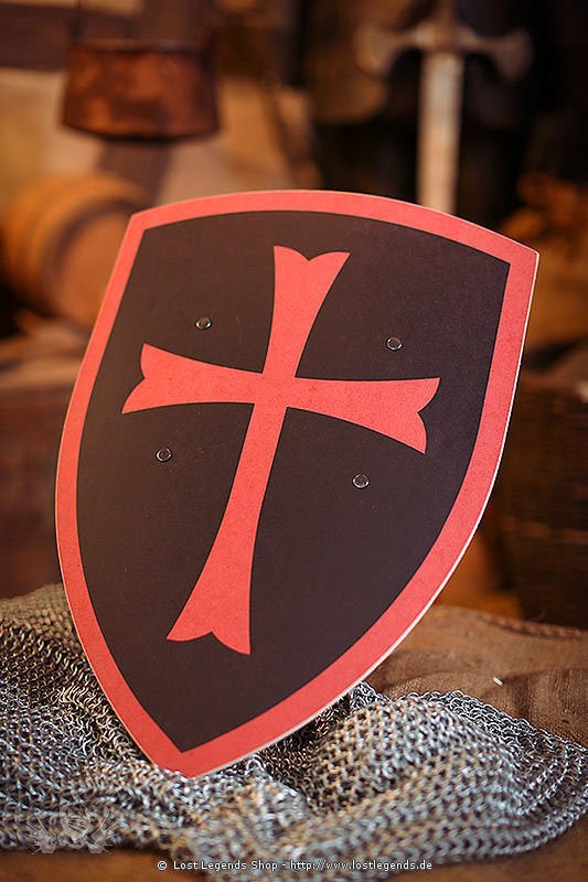 Gebogene Holzschild für Kinder mit Armriemen auf der Rückseite und Tempelritter Bemalung in schwarz-rot.