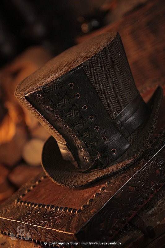 Steampunk Zylinder mit Tweedkorpus und Kunstlederverzierung, Zierschnürung vorne.