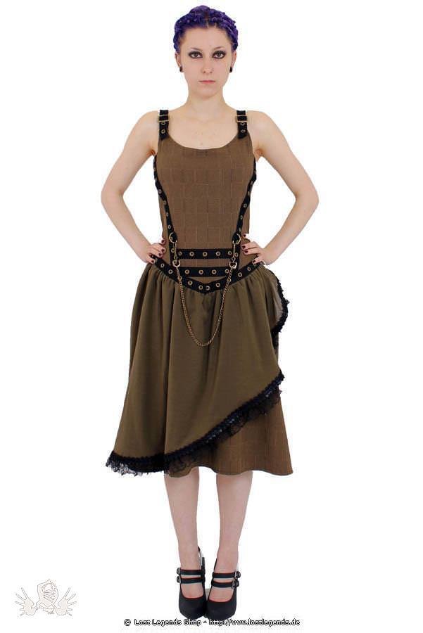 Gorgeous steampunk style pleated skirt dress in heritage stretch fabric with soft angled overlay with lace trim.There are adjustable canvas and brass eyelet straps with eyelet and tape detail around the bodice.Brass d rings, dog clips and chain give an authentic steampunk feel.It is 43ins long (109cms) with a 15ins back zip(38cms)