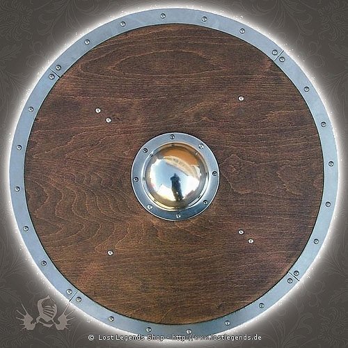 Wikingerschild Yngve aus Holz mit Metallbeschlägen, Griff und Lederriemen auf der Rückseite.