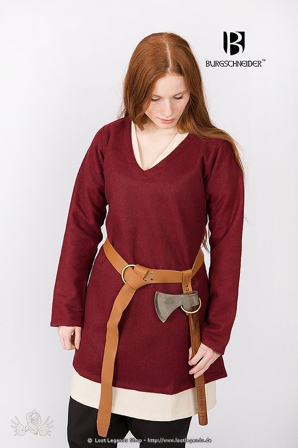Schlicht mittelalterliche Tunika aus dunkelrotem Wollgemisch mit angenehm kurzem Rock, kann auch als Übertunika getragen werden z.B. an kälteren Tagen. Besonders beliebt auch bei echten Weibsbildern, die sich mit klassischem Rock und Bluse nicht zufriedengeben wollen.