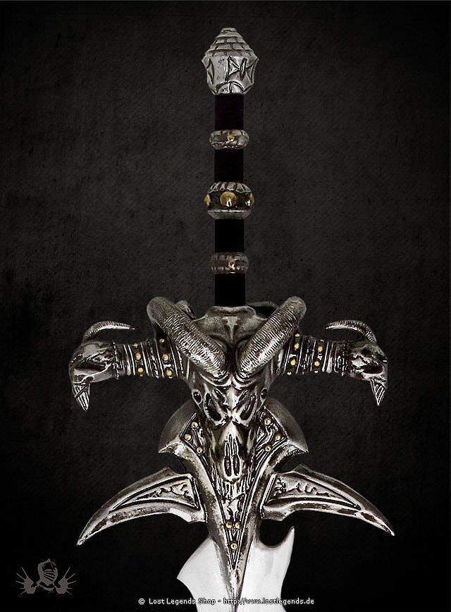 Das World of Warcraft Frostmourne Schwert ist ca. 120 cm lang, die Klingenlänge beträgt ca. 75 cm und der Klingenumfang ca. 22 cm. Frostmourne ist das Schwert des Lichkönigs Arthas Menethil. Als detailgetreue Nachbildung des Vorbilds aus dem Spiel erfreut die Waffe schon rein äußerlich. Der Griff ist mit Wildleder umwickelt, der Kernstab besteht aus Fiberglas und das Schädelparier aus Hartgummi.