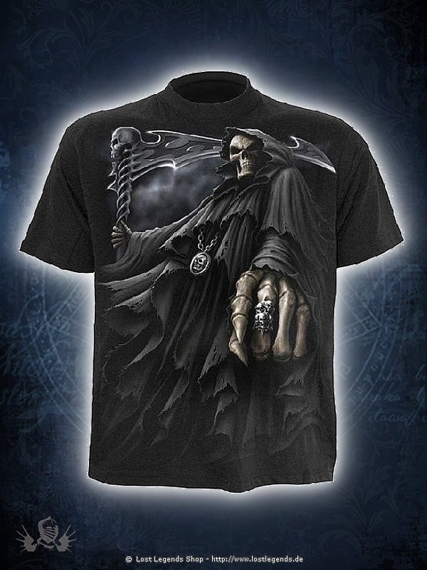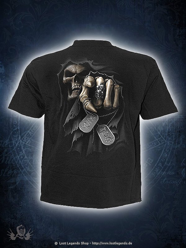 The Grim Reaper skeleton holding his deadly skull clad scythe points out his next unwilling victim and it s you. The back showing the reapers engraved dog tags, can you avoid his deathly touch?