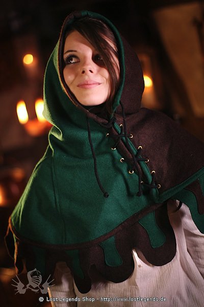 Zweifarbiger mittelalterlicher Gugel aus Wollfilz mit Zipfelrand und Schnürung vorne.
