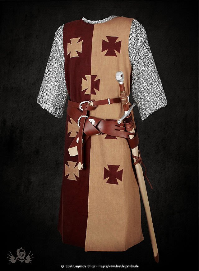 Auf der Vorderseite ist dieser Wappenrock mit breiten Tatzenkreuzen besetzt. Er ist aus reiner Baumwolle gefertigt. Für eine erhöhte Beinfreiheit und verbesserte Beweglichkeit des Trägers sorgen die Schlitze an Hüfte und Rücken.