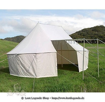 Dieses große Zweimast-Mittelalterzelt hat eine Grundfläche von ca. 24 m2. Es bietet damit genug Platz für ca. 6-7 Personen inklusive Gepäck. Hier kann also sowohl eine kleine Mannschaft, also auch eine ganze Familie bequem wohnen, schlafen und lagern. Durch das Vordach im Eingangsbereich ist zudem ein geschütztes Sitzen möglich. Ein perfektes Zelt für das Lagern auf Mittelaltermärkten oder für LARP.